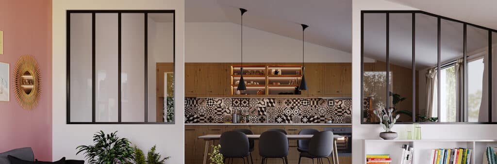 - Verrière de cuisine : La tendance phare. Séparez la cuisine du salon pour contenir les odeurs et le bruit, tout en gardant un œil sur vos invités.